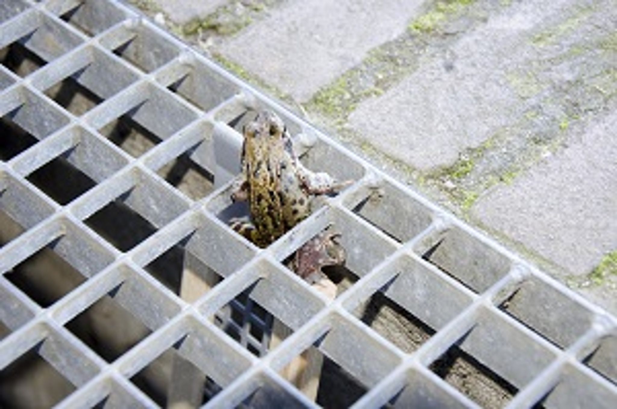 Naast de risicovolle oversteek van wegen en fietspaden, is er nog een groot gevaar voor amfibieën; een val in meter- en leidingputten, holtes onder deurroosters, keldergaten en kokers. Ook loopkevers en kleine zoogdieren zoals spitsmuizen vallen in de putten, waardoor het aantal slachtoffers oploopt tot in de miljoenen. Door de diepte van de putten en omdat er vaak nog water instaat, wordt het onmogelijk voor de dieren om eruit te klimmen of springen. Zonder hulp wacht hen alleen de verdrinkings- of uithongeringsdood. RAVON heeft daarom samen met Vivara Natuurbeschermingsproducten de kikkertrap ontwikkeld, een trap die tussen de bodem van de put en het rooster wordt bevestigd, zodat amfibieën via de trap naar boven te kunnen klimmen. Hierdoor kunnen de dieren zich voortplanten en gaan de soorten niet verloren.